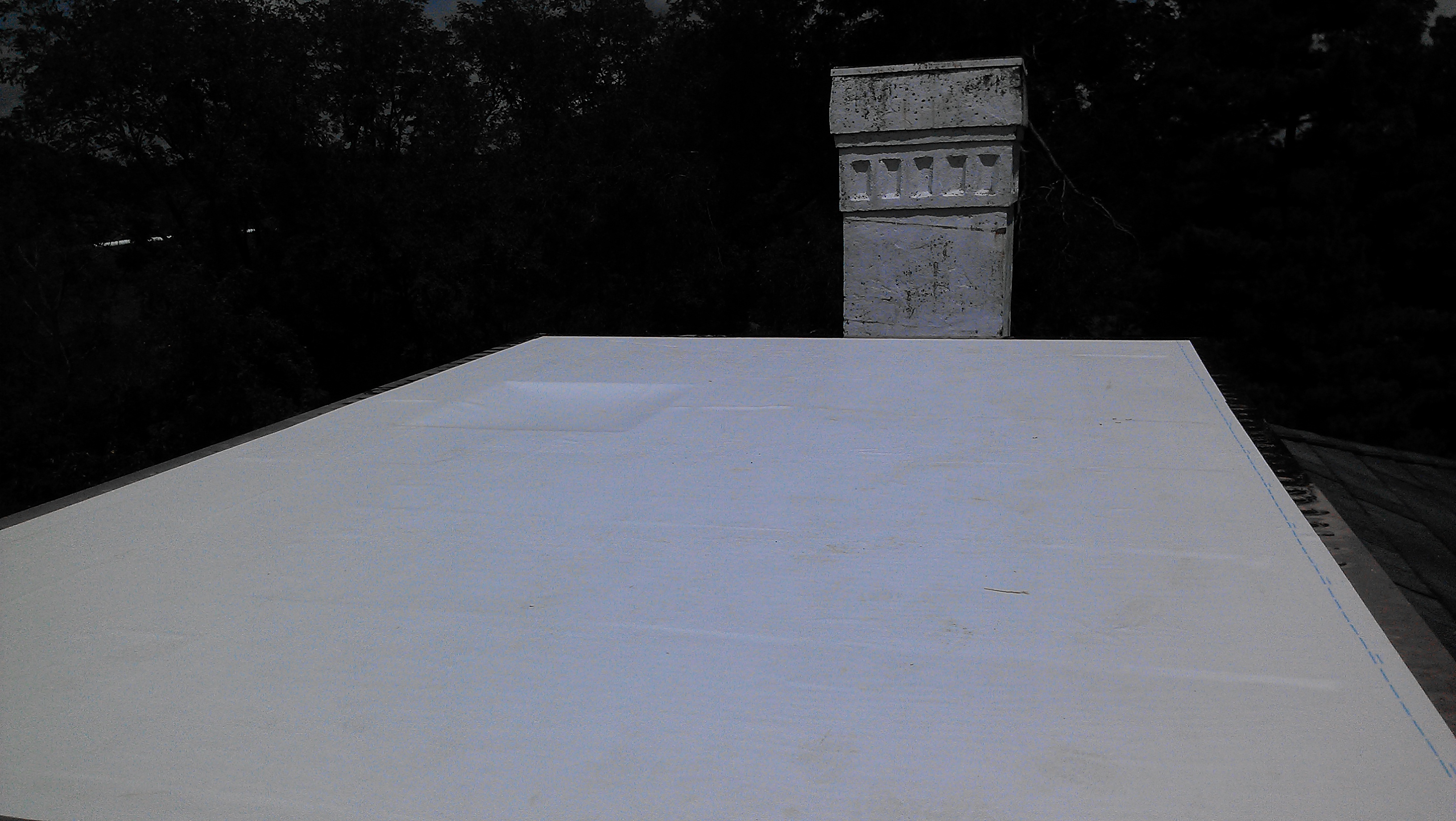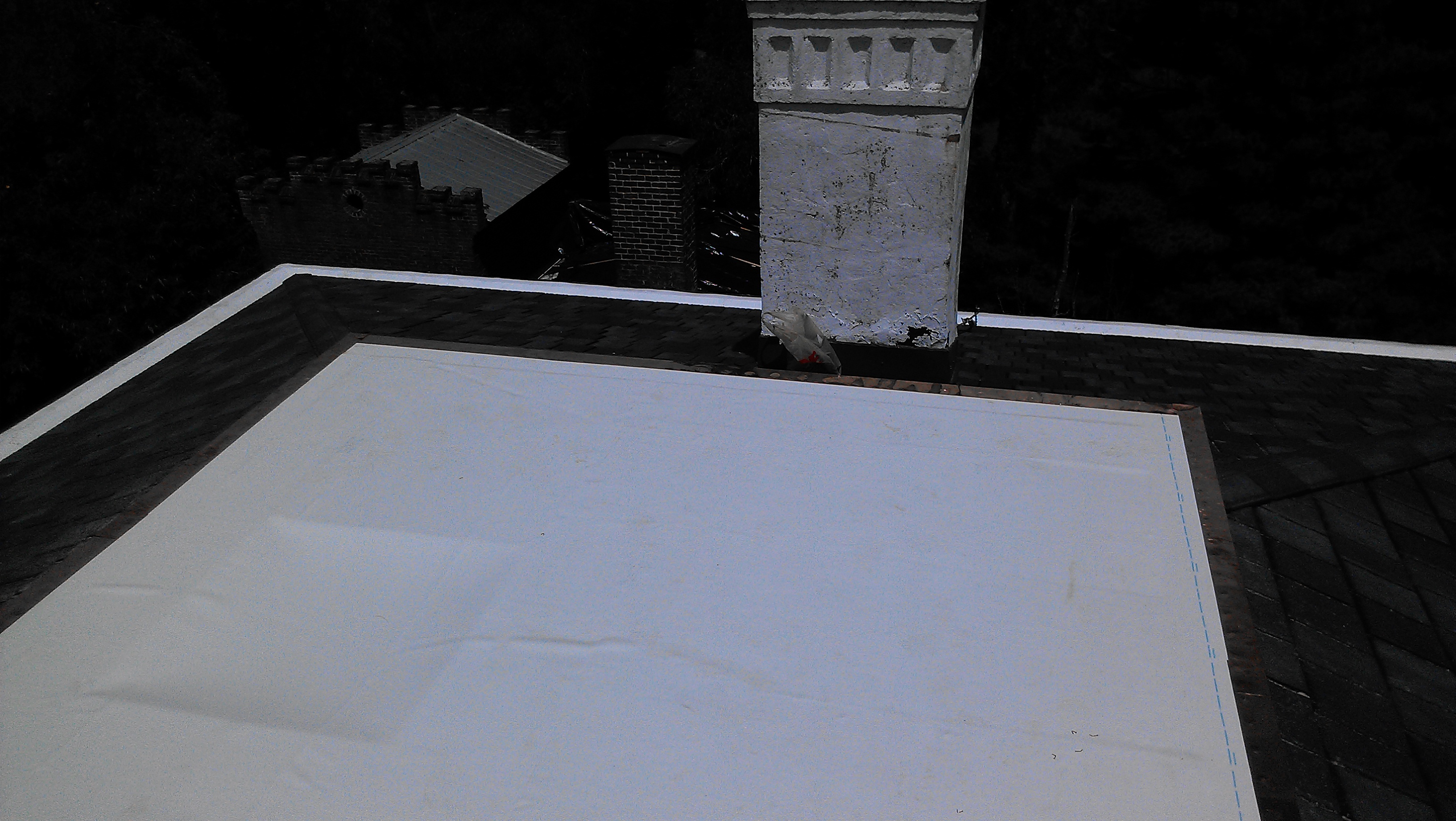I had quite a time finding someone to re-line the built-in box gutters on the upper roof. A “box gutter” is basically a built-in gutter system that’s integrated into the roof or eave structure, which is generally difficult to maintain and hard to repair. It’s basically a wood trough – in my case part of the large corbled eave – which is lined with some sort of metal or rubber. I talked with several companies and copper workers who either didn’t want to do it, or didn’t want to do it in a way that would be guaranteed to last. Fortunately the guys over at Drain-Right had a great solution, though of course it came with a high price tag. But since they guaranteed their work and the product they used for 10 years, and would be able to re-coat and re-guarantee for 10 years after that, I thought it was worth it.