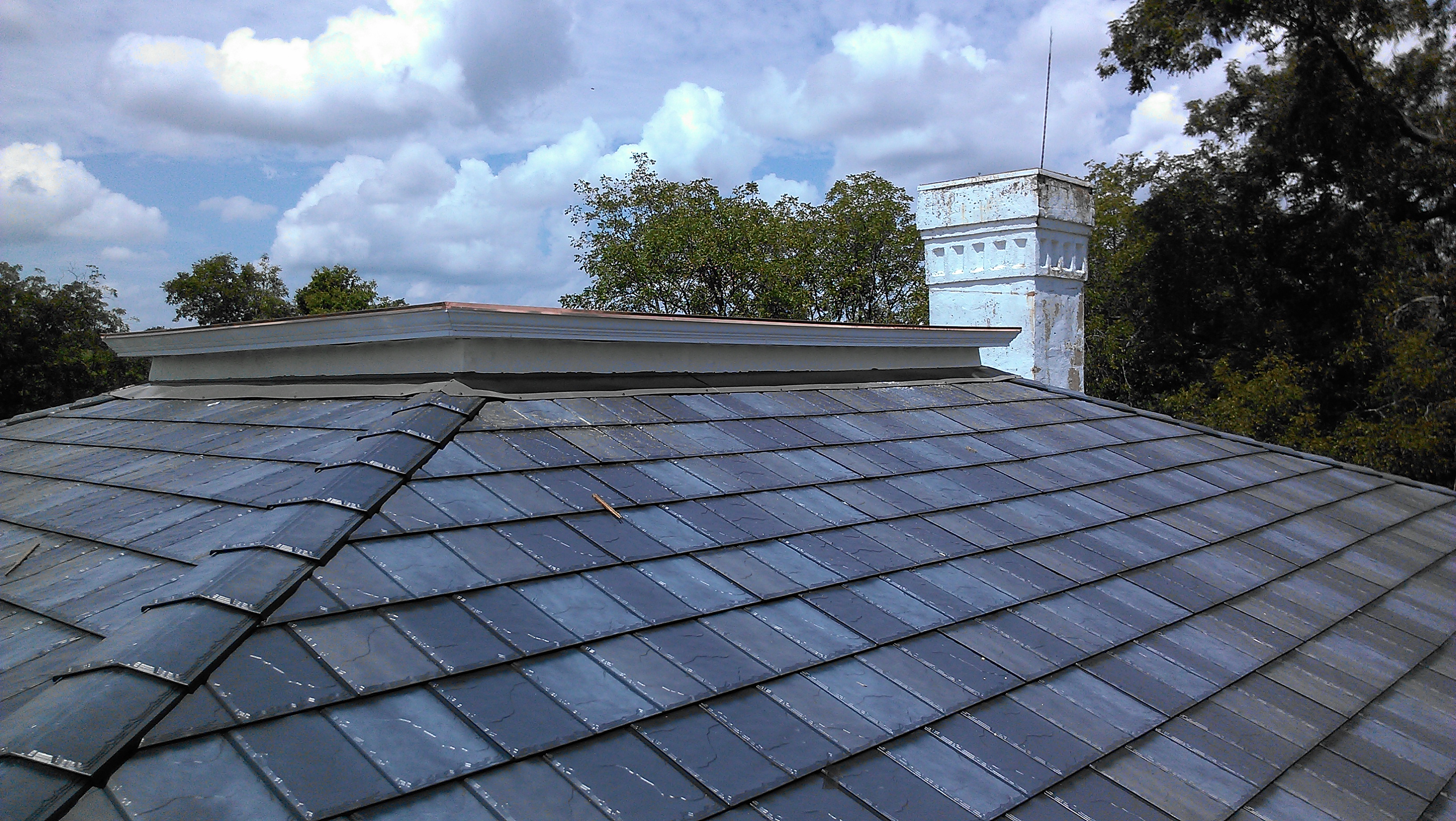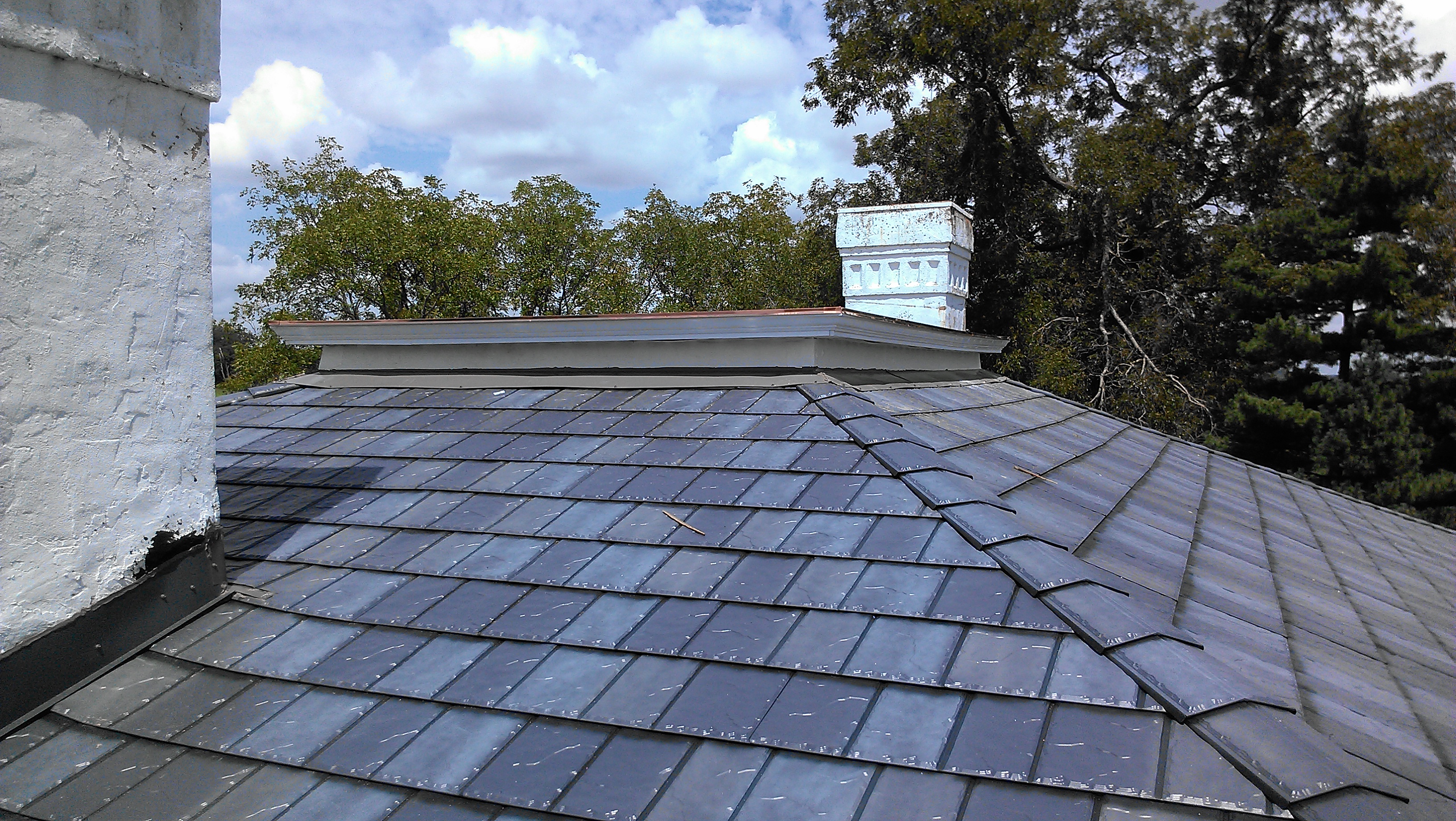 When trying to decide on what type of roof to put on, I was basically trying to find something that would look period, but have the greatest longevity. Asphalt shingles were out, and though it is possible that sheet metal could have been used when the house was built, it was unlikely due to the decking used and I didn’t think I would be happy with the final look. The other two feasible options were either a metal shingle, which is what was already on the house and possibly always was, or slate – either real or synthetic. I loved the idea of slate but both the cost, as well as the added weight of the final roof, made it prohibitive. All of the info I found on synthetic slate was disappointing when longevity was concerned. So we were down to some type of metal shingle. I looked into reproduction decorative shingles which were used in the mid 19th century, but none of them carried with them a decent warranty, which was pretty important to me. As it turns out Best Buy Metals in Cleveland is a supplier of a type of slate-look steel shingle with an enamel finish which carried a lifetime guarantee. It was more expensive than some of the other options out there but it looked great and felt pretty confident that barring another act of nature, I wouldn’t have to re-roof in my lifetime…. we’ll see!