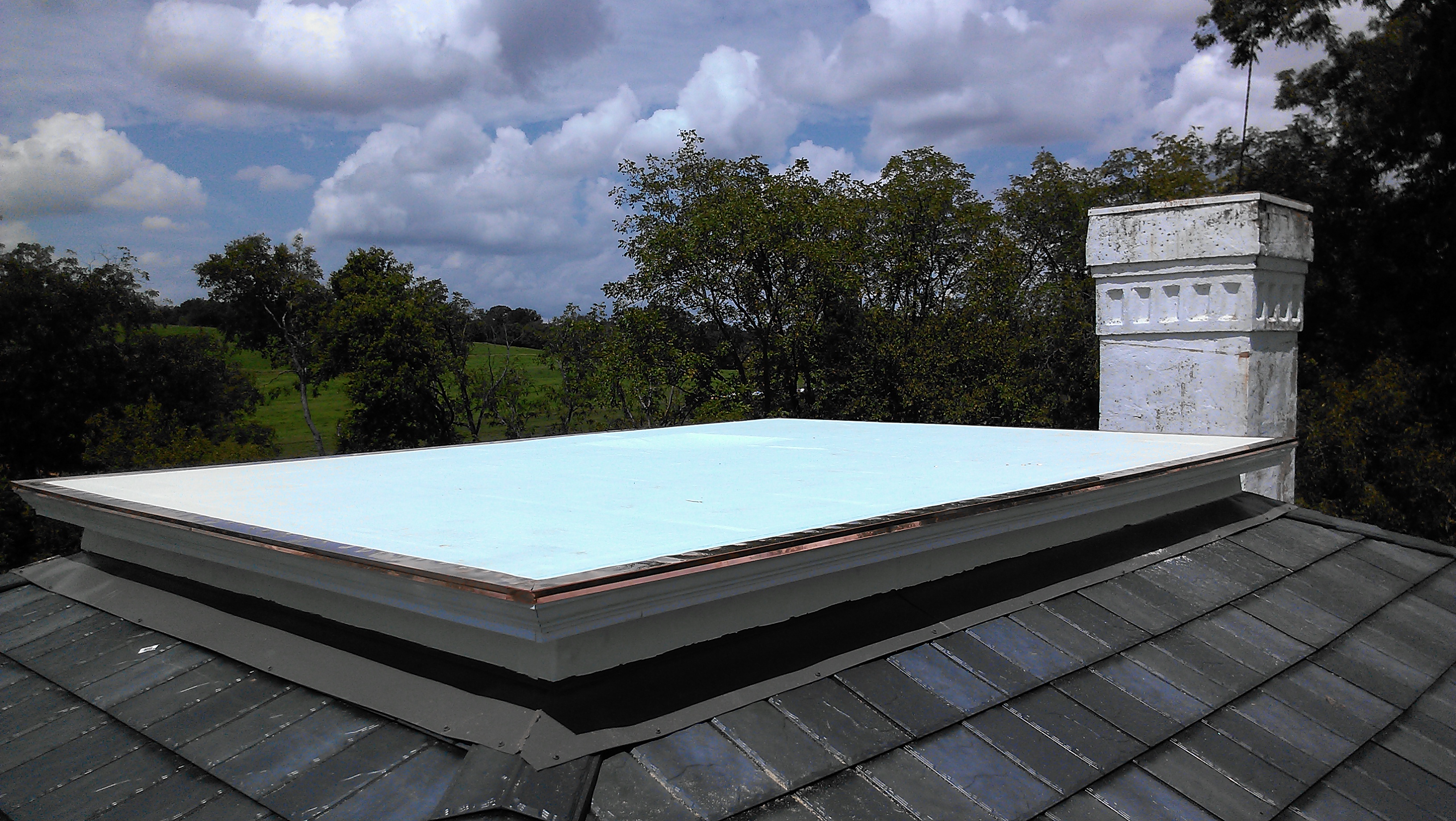 I had wanted to go with a simple copper or lead lining as that would be the most authentic option. But I was talked out of this by more than one metal worker who told me that with this particular gutter, copper wouldn’t last as long as I wanted it to for various reasons. One of which was the possible corrosion due to the type of metal roofing we were going to have installed. The solution ended up being a “rubberized” aluminum gutter liner with a decorative copper drip edge. They had to use a company in Atlanta to fabricate the size of aluminum trough I would need. It was screwed into place and all of the screws and seams heavily caulked. After that, latex soaked fabric strips were adhered to the seams and edges of the aluminum to seal everything down. Following that a thick rubber coating was applied three times to all of the gutter surfaces. Now, everything is water tight and corrosion resistant. The rubber coating product that was used has a warranty of ten years. After that we can pressure wash the surface and apply another coat which would have another ten-year warranty.